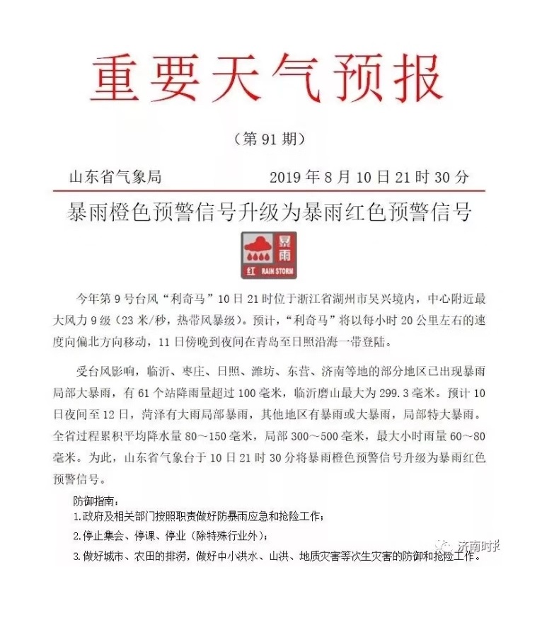 8月9日開始,受超強臺風“利奇馬”的影響,山東省氣象臺于10日21時30分將暴雨橙色預警信號升級為暴雨紅色預警信號。