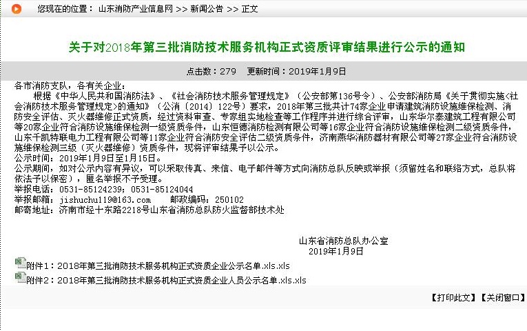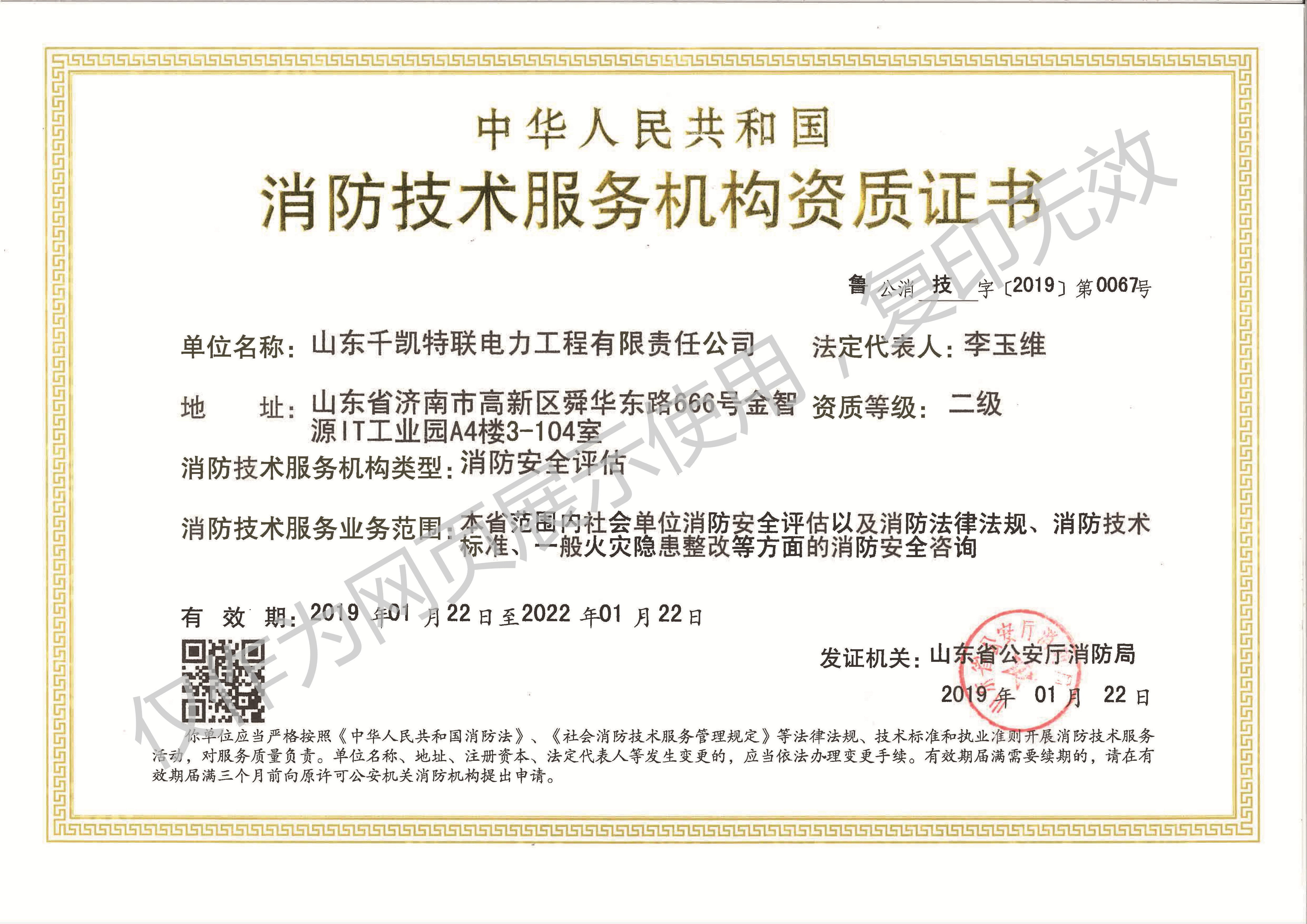 在公司領導和各部門的全力配合下,經(jīng)過材料申報、嚴格的現(xiàn)場條件審查、公安部消防局材料復核等層層考核,山東千凱特聯(lián)電力工程有限責任公司于2019年1月22日順利取得了消防技術服務機構(gòu)資質(zhì)證書(消防安全評估二級資質(zhì))。此證書是由山東省公安廳消防局批準并頒發(fā),可承擔本省范圍內(nèi)社會單位消防安全評估以及消防法律法規(guī)、消防技術標準、一般火災隱患整改等方面的消防安全咨詢。
