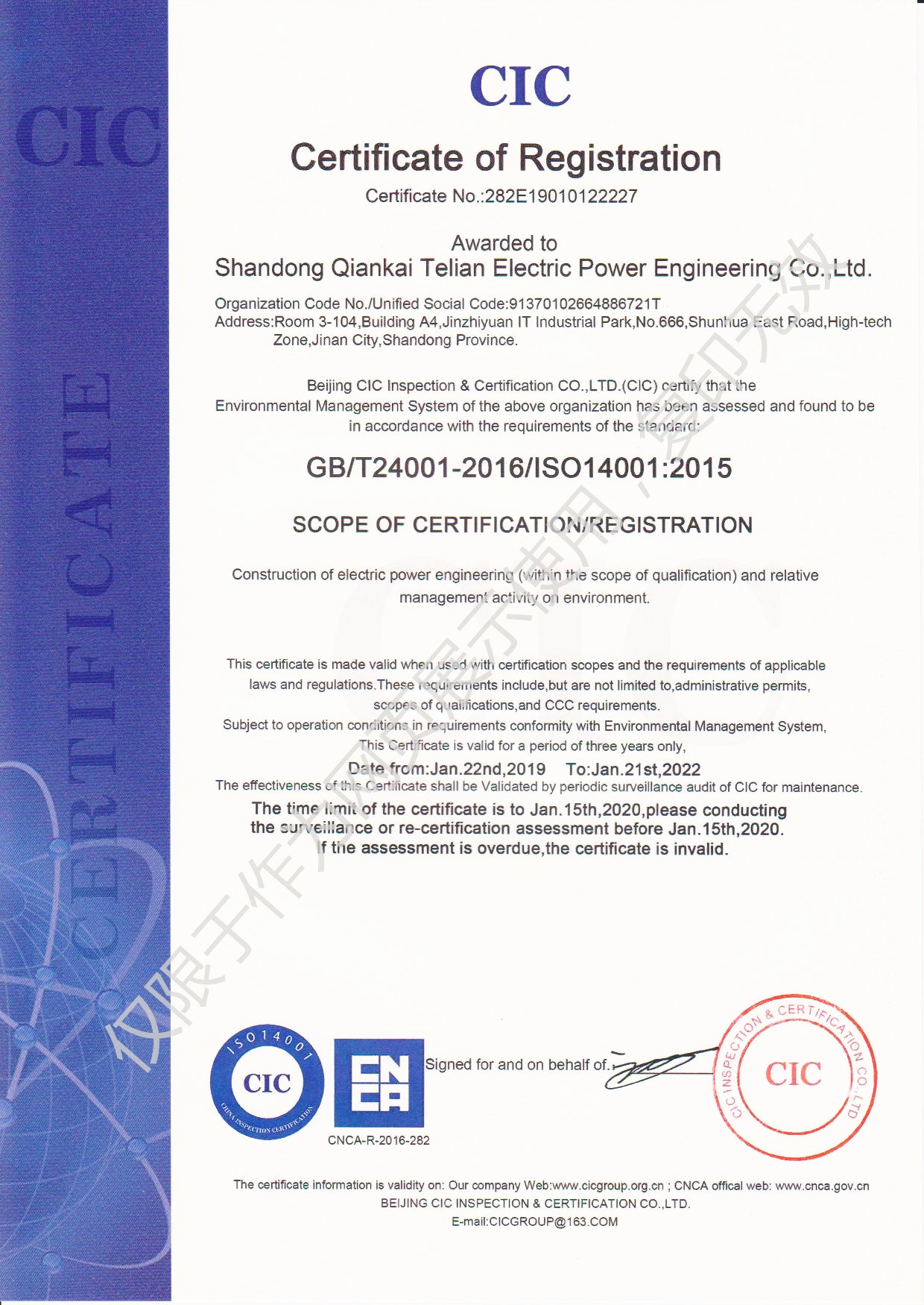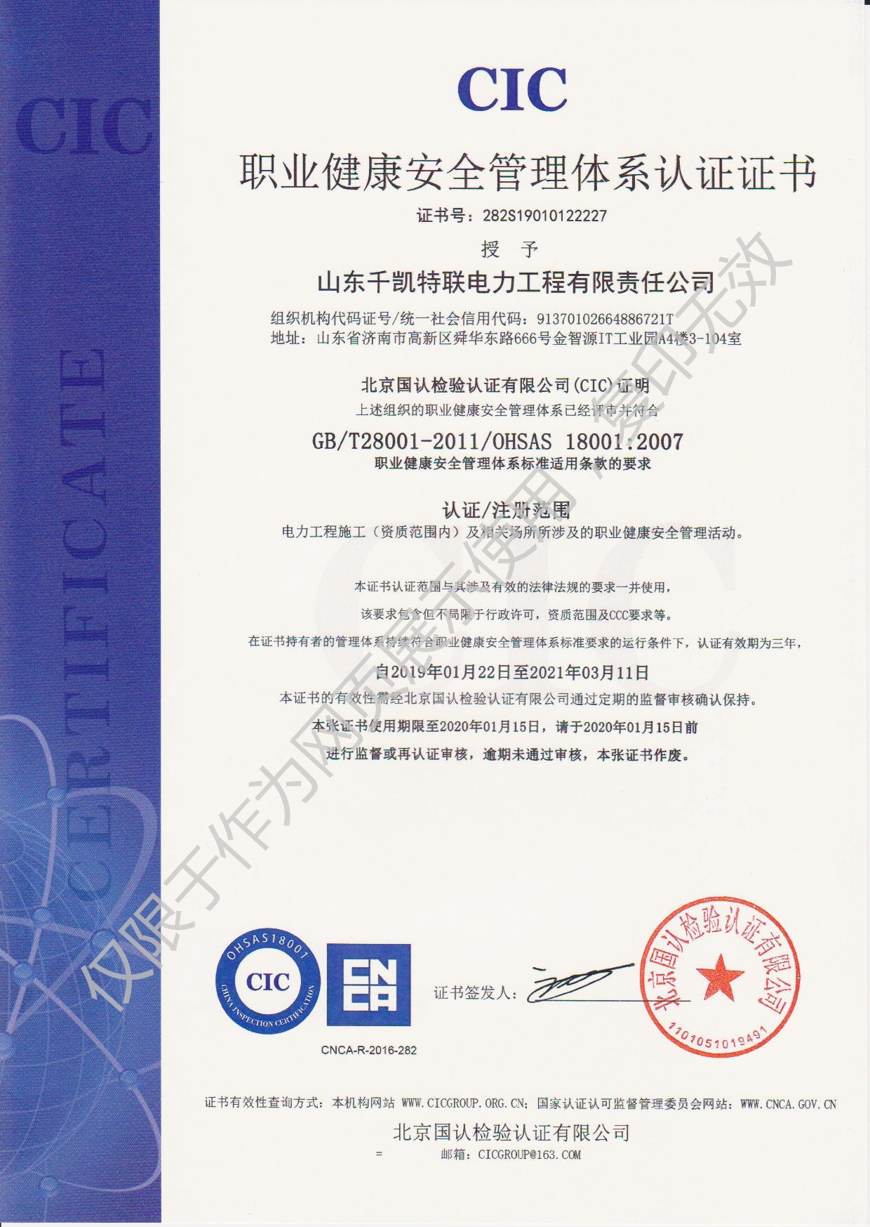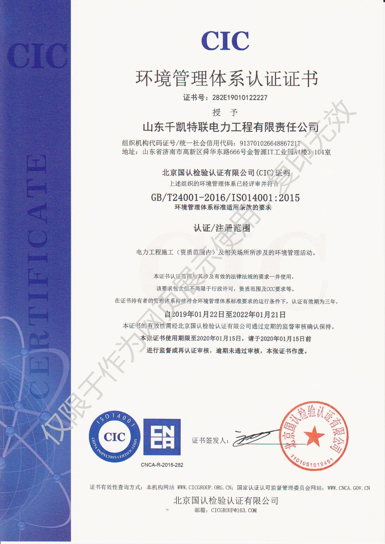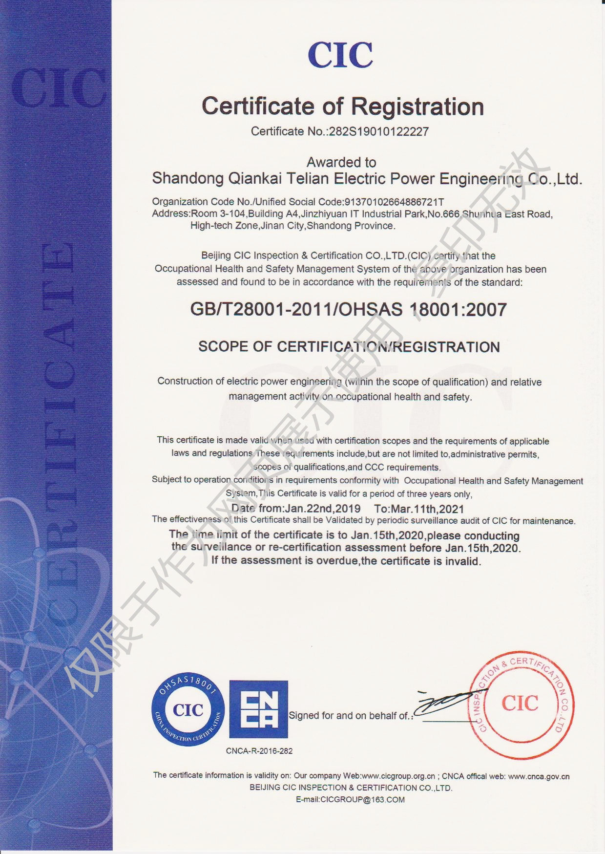 2019年1月22日,山東千凱特聯(lián)電力工程有限責(zé)任公司順利通過ISO14001環(huán)境管理體系認(rèn)證和OHSAS18001職業(yè)健康安全管理體系認(rèn)證并取得證書。加上之前取得的ISO9001質(zhì)量管理體系證書,三大體系證書的取得是公司各項(xiàng)管理工作的規(guī)范化、標(biāo)準(zhǔn)化的全面檢測(cè)。我們將進(jìn)一步優(yōu)化和規(guī)范各項(xiàng)管理制度,不斷提高體系運(yùn)行的有效性,不斷提高公司的管理水平,共同推進(jìn)公司的快速發(fā)展。